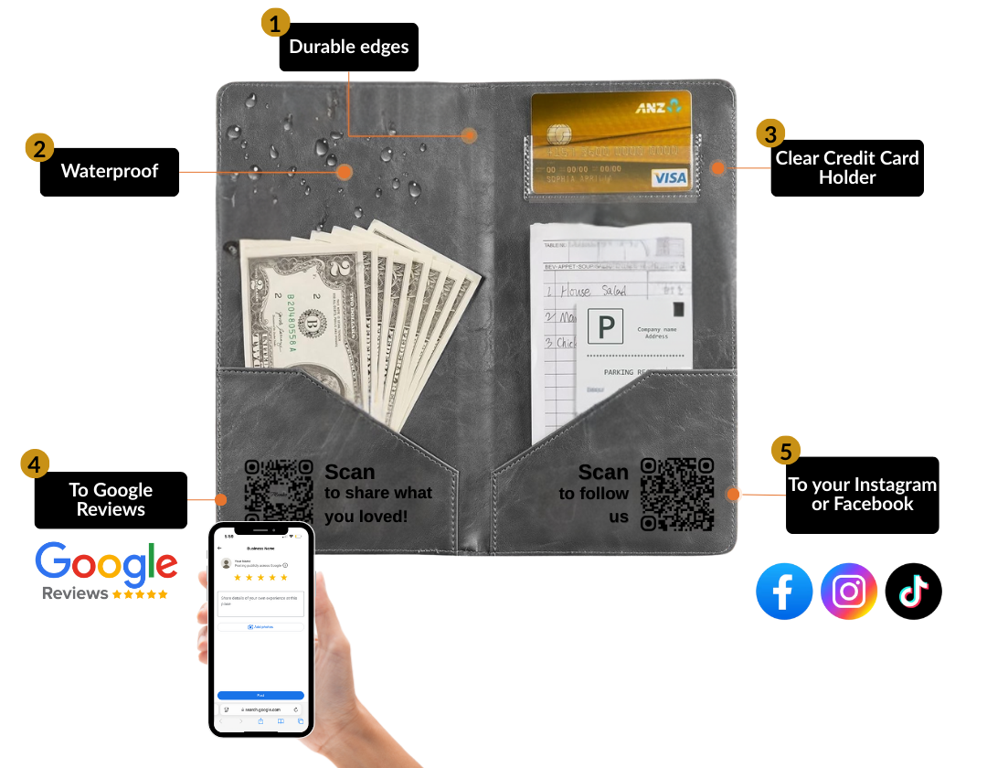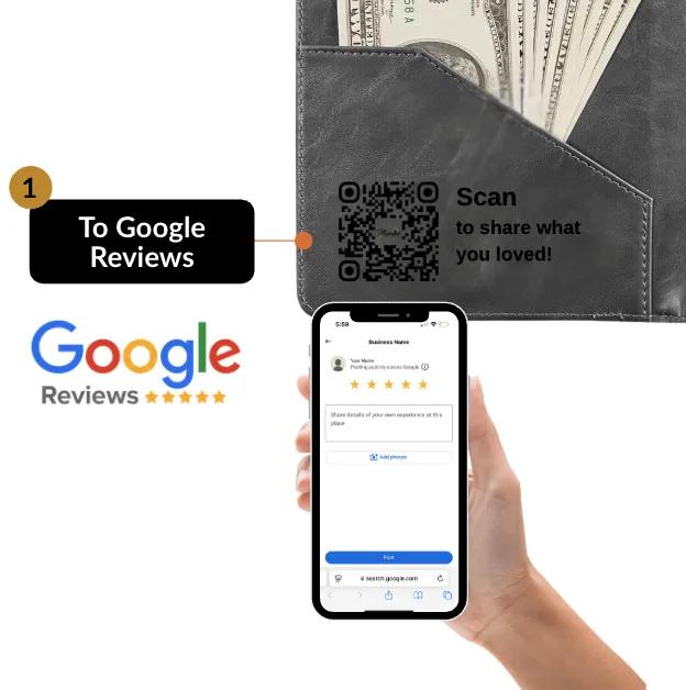 Get a custom-engraved QR code that sends guests straight to your Google or social media pages.